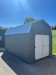 Size: 10′ x 16′ Building Type: Compass Series High Barn Siding: Metal Main Color: Gray Metal Roof Color: Gray Trim Color: Bright White Metal Door: Gray Metal